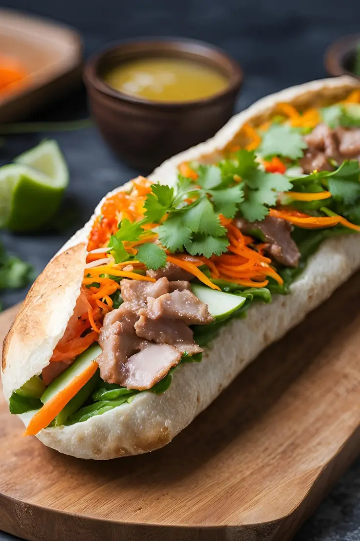 A crusty baguette that’s crackly on the outside but soft inside is stuffed with perfectly charred pork, vibrant pickled veggies that create a rainbow moment, and fresh cilantro that adds a pop of green.