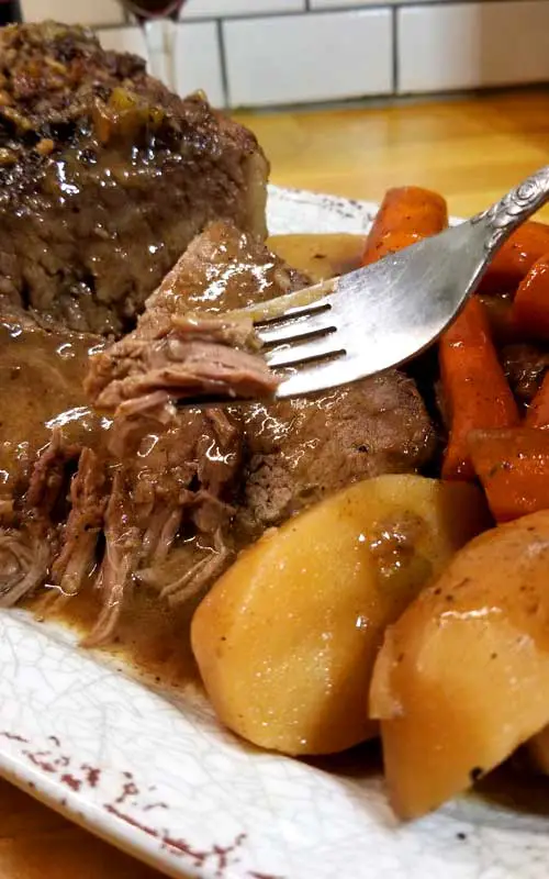 Ingredients: Chuck roast, carrots, potatoes, onions, beef broth, Worcestershire sauce, thyme, rosemary, salt, pepper.